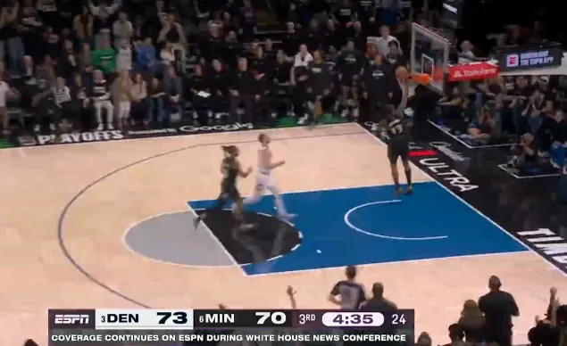 虎扑04月26日讯 NBA季后赛,掘金对阵森林狼的比赛正在进行中。第三节比赛中,戈贝尔抢断约基奇接球,多森姆反击砍下26分追至1分打停掘金。来源:虎扑虎扑04月26日讯 NBA季后赛,掘金对阵森林狼的比赛正在进行中。第三节比赛中,戈贝尔抢断约基奇接球,多森姆反击砍下26分追至1分打停掘金。来源:虎扑